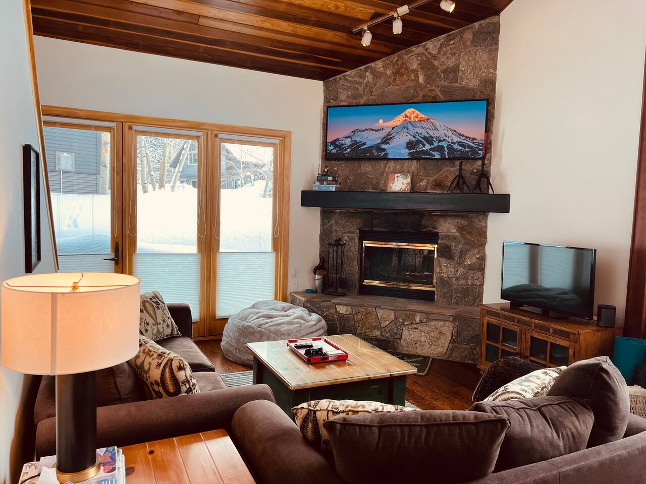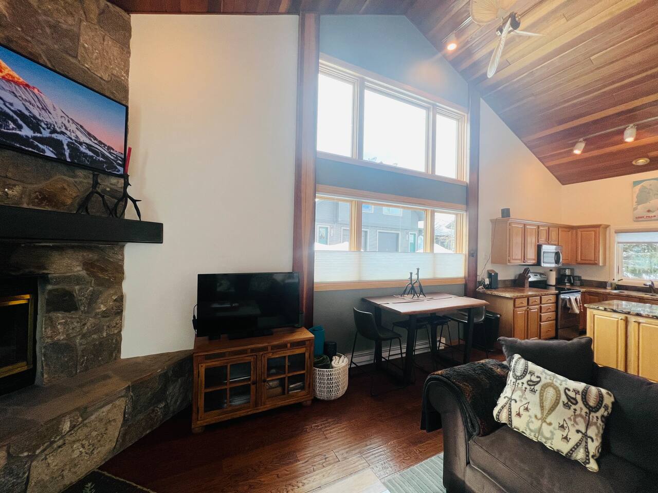 Ski*In*Ski*Out Condo - Newly renovated in fall of 2022. Located at the base of the mountain and directly across Black Eagle Rd. from the Bear Back Poma, 100 steps from the front door. The Lower Chaparral is set for the ski enthusiast by ski enthusiasts. Cozy and spacious with vaulted wood ceilings, local art, bar, games and a wood fireplace. All the necessity for an epic ski tip. A great base camp for those looking to walk out your front door and hit the slopes and easy return back to relax and Apres Ski! Entertain yourself with AppleTV and Gamestick. The kitchen is equip for cooking and entertaining. If you would rather dine out there are multiple restaurants within walking distance. Access to a heated garage is provided where you can store your ski gear, park, and chop wood. The unit is limited to 2 vehicles and there is additional parking located adjacent to the unit. The Lower Chap is rarely rented and is very loved.