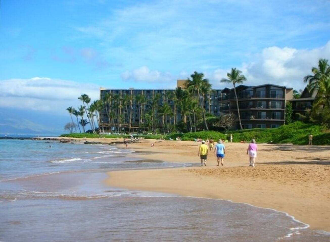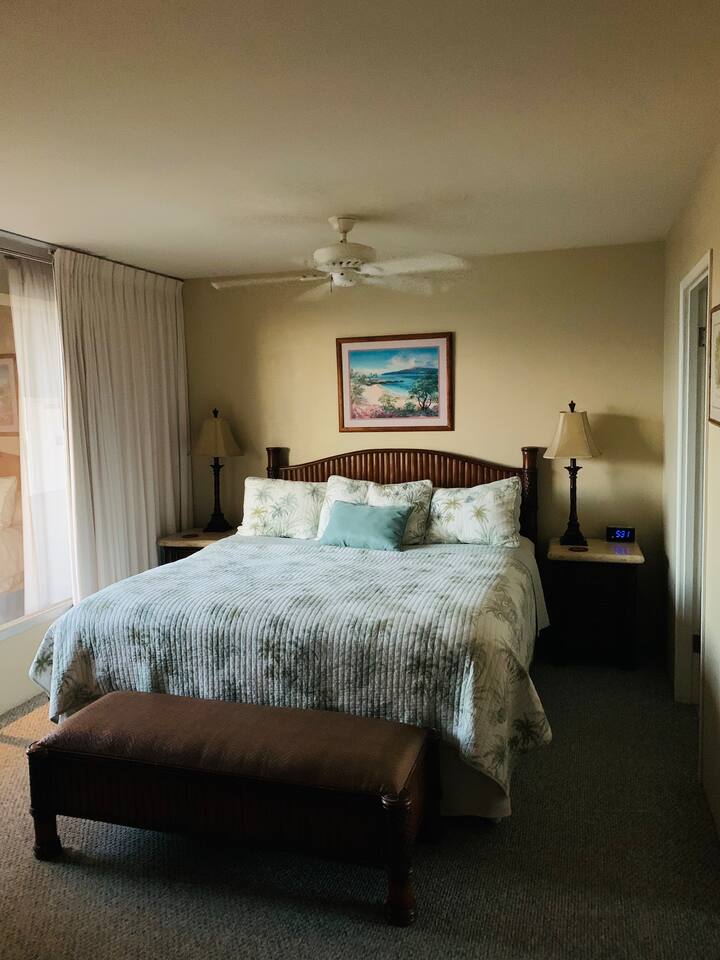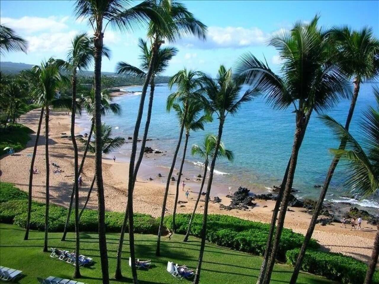 Premium ocean front condo with the best location (2nd unit from the ocean end of building), on the best beach, and the best part of Maui -- at the Mana Kai. Located at the north end of Keawakapu Beach, you've got a mile long beach and some of the safest swimming and best snorkeling to enjoy. The trade winds keep you cool and comfortable, but every room has a ceiling fan and air conditioning. The building has free Wi-Fi for guests and is smoke free. There is reserved parking and laundry facilities. Gas BBQ grills are available on the lawn and the kitchen is fully equip. The only thing between the unit and the ocean is the pool and grassy lawn for lounging. Being second from the ocean end of the building the unit is very quiet, the waves tranquilize you to sleep every evening in our king size beds. Both bedrooms have unobstructed views of the ocean so that you can always enjoy the view. The building is small enough to have a warm friendly feel but large enough to offer some great amenities such as a 808 General Store, Surf Shack rentals, Maui Yoga Path, business center, gym, and an activities center to help with any bookings you may need. Located just blocks north of Wailea, you also have easy access to many golf courses, the Shops at Wailea, and all that south Maui has to offer. Loop