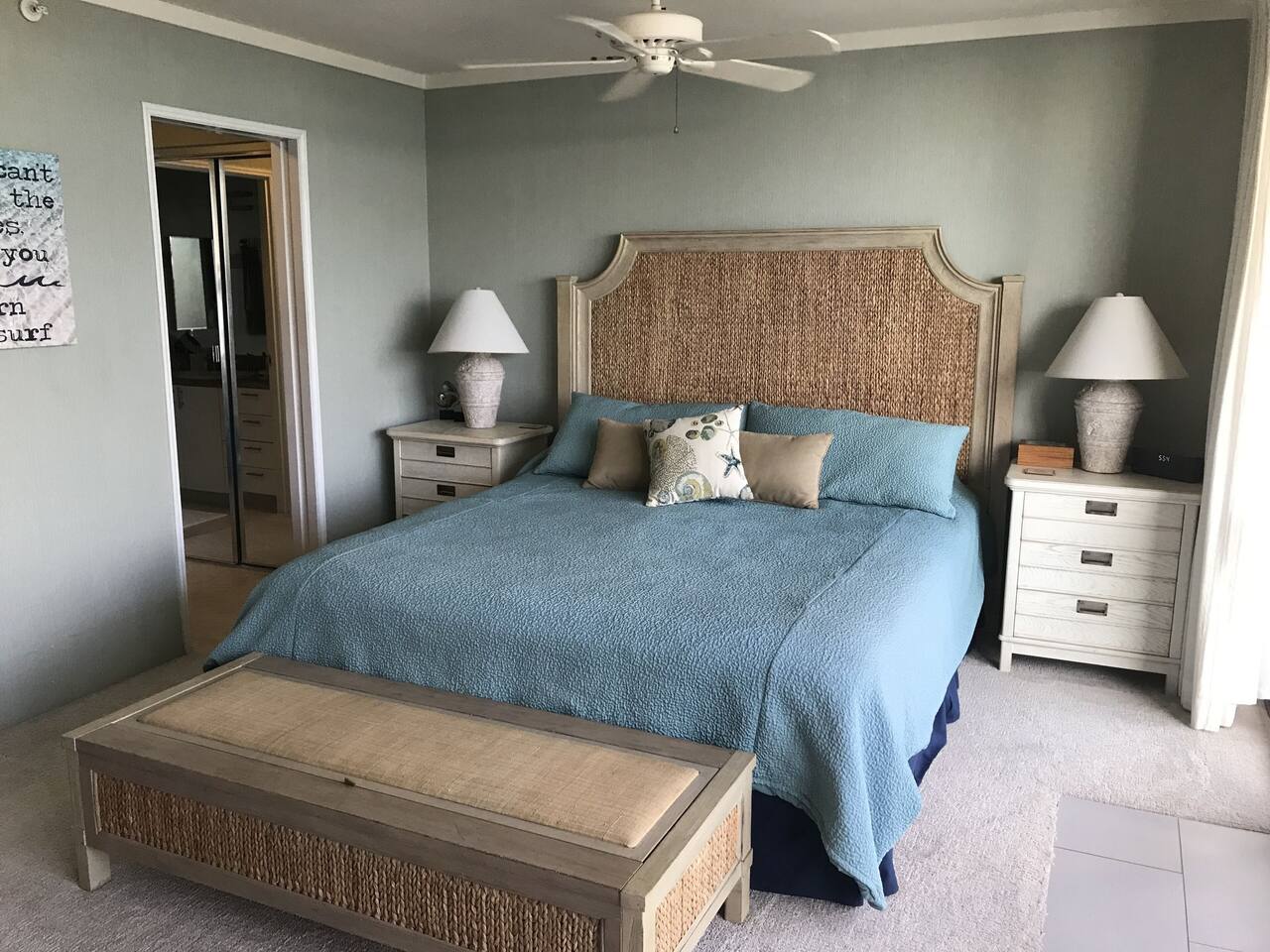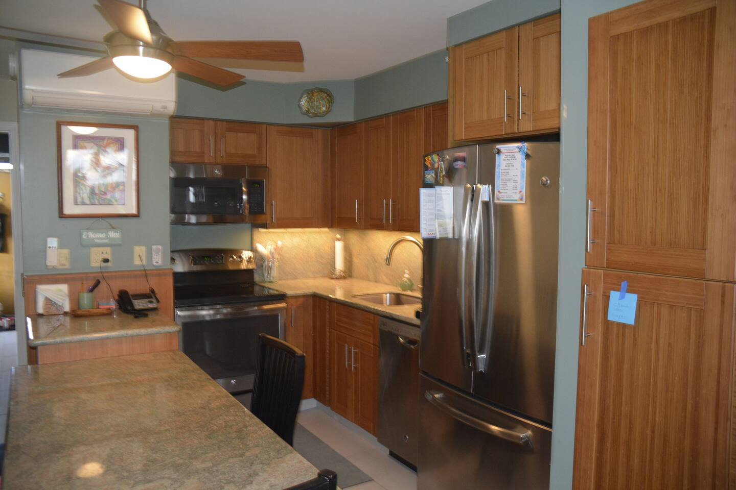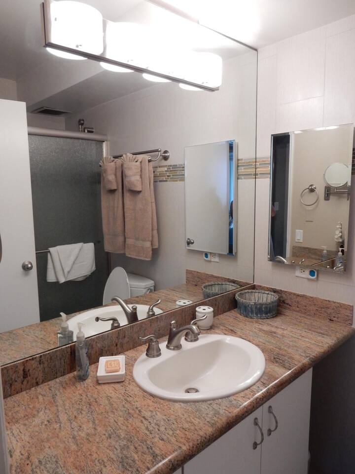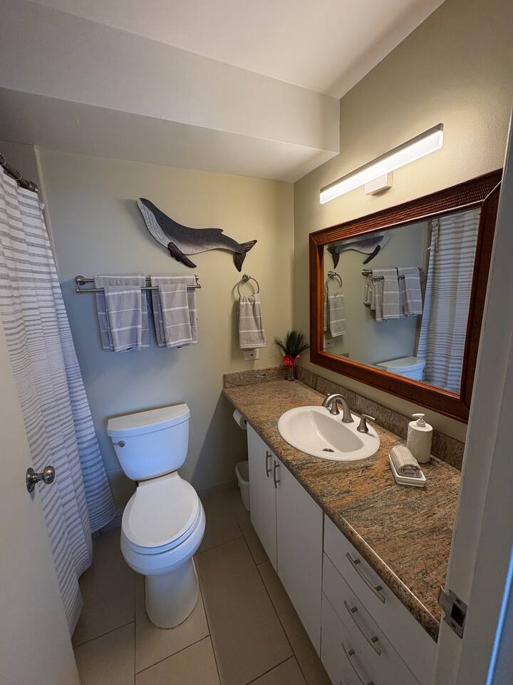 Premium ocean front condo with the best location (2nd unit from the ocean end of building), on the best beach, and the best part of Maui -- at the Mana Kai. Located at the north end of Keawakapu Beach, you've got a mile long beach and some of the safest swimming and best snorkeling to enjoy. The trade winds keep you cool and comfortable, but every room has a ceiling fan and air conditioning. The building has free Wi-Fi for guests and is smoke free. There is reserved parking and laundry facilities. Gas BBQ grills are available on the lawn and the kitchen is fully equip. The only thing between the unit and the ocean is the pool and grassy lawn for lounging. Being second from the ocean end of the building the unit is very quiet, the waves tranquilize you to sleep every evening in our king size beds. Both bedrooms have unobstructed views of the ocean so that you can always enjoy the view. The building is small enough to have a warm friendly feel but large enough to offer some great amenities such as a 808 General Store, Surf Shack rentals, Maui Yoga Path, business center, gym, and an activities center to help with any bookings you may need. Located just blocks north of Wailea, you also have easy access to many golf courses, the Shops at Wailea, and all that south Maui has to offer. Loop