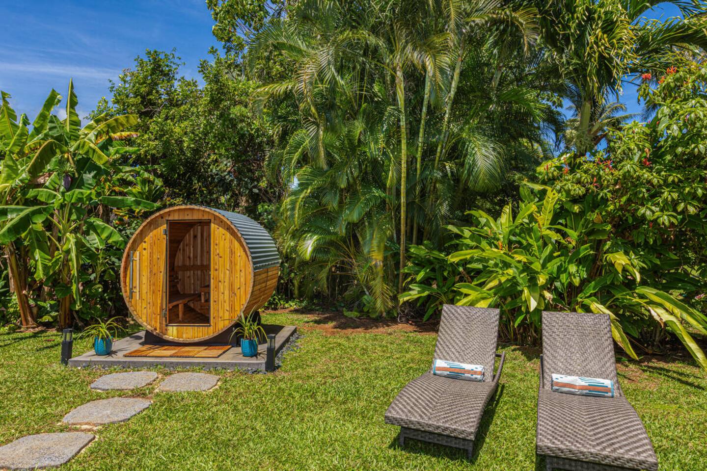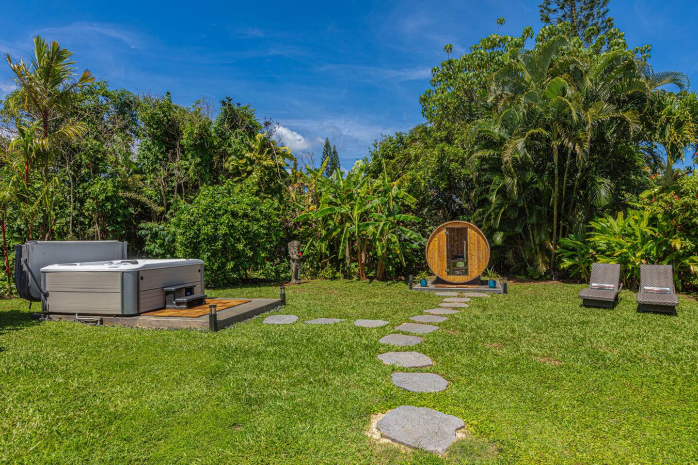 Escape to Hale Kalani, a charming 3-bedroom surf bungalow nestled in the heart of Princeville on Kauai’s renowned North Shore. Thoughtfully designed for relaxation and island living, this single-level haven features a private cedar barrel sauna, a brand-new hot tub, and all the comforts of home. As the newest addition from a team of experienced hosts—proudly boasting over 100 five-star reviews—Hale Kalani promises an exceptional stay.