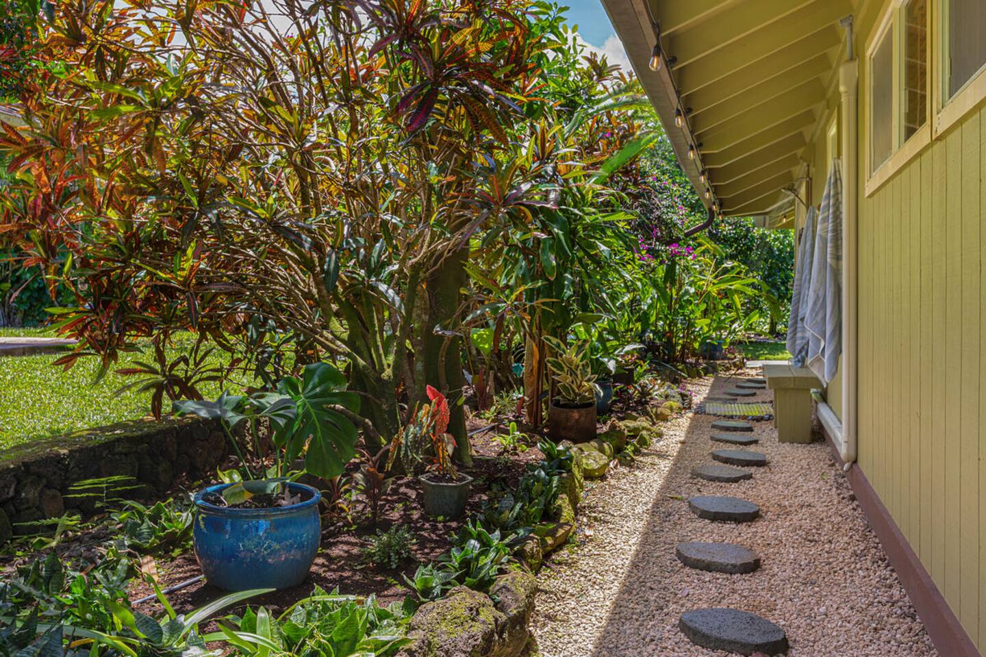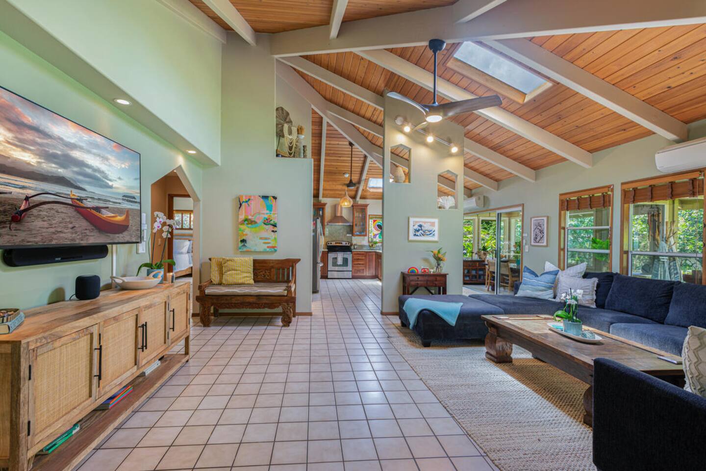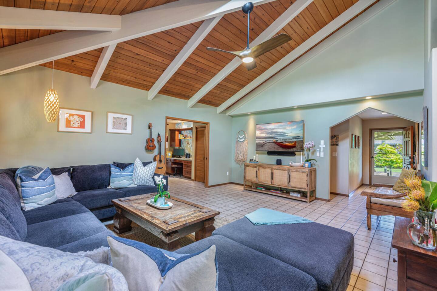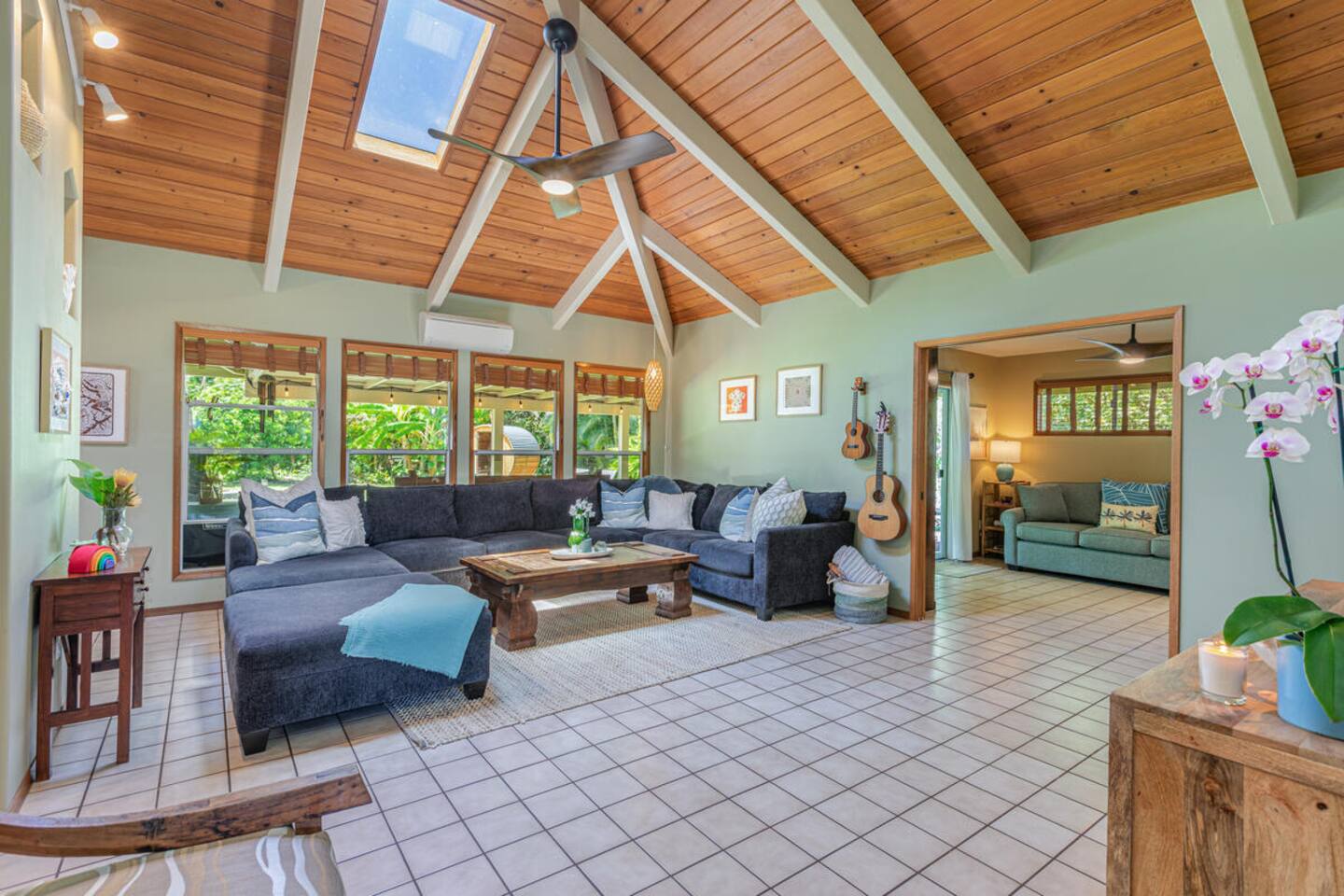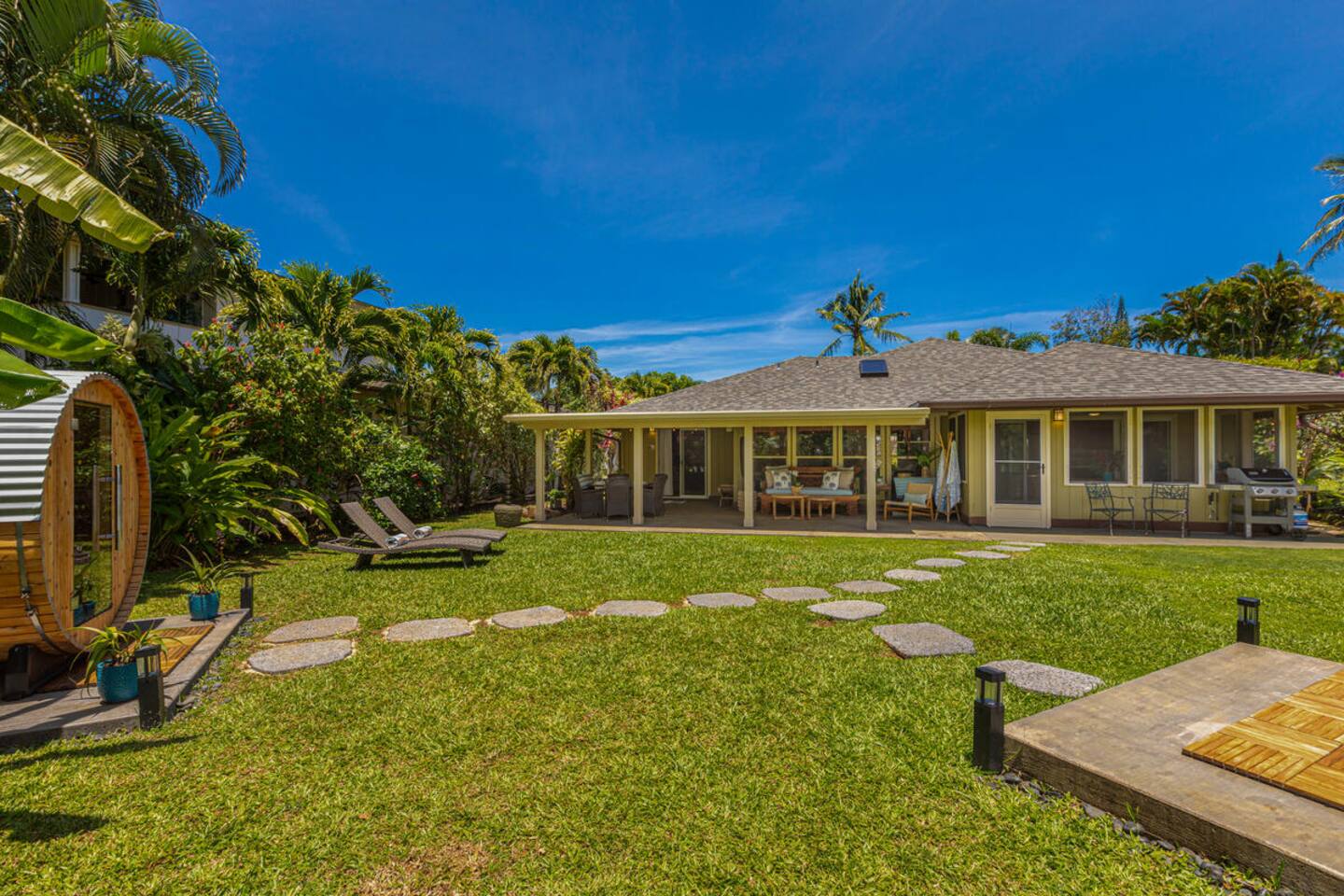 Escape to Hale Kalani, a charming 3-bedroom surf bungalow nestled in the heart of Princeville on Kauai’s renowned North Shore. Thoughtfully designed for relaxation and island living, this single-level haven features a private cedar barrel sauna, a brand-new hot tub, and all the comforts of home. As the newest addition from a team of experienced hosts—proudly boasting over 100 five-star reviews—Hale Kalani promises an exceptional stay. Ideally located, this serene getaway puts you within minutes of Kauai’s most treasured spots. Take a short drive to the world-famous Hanalei Bay, where you’ll find pristine sandy beaches, epic surf, and breathtaking mountain vistas. Anini Beach is just a 10-minute stroll away—perfect for snorkeling in calm, turquoise waters protected by the island’s largest reef. For everyday conveniences, the Princeville Center is within walking distance, offering a grocery store, restaurants, and boutique shops. On Saturdays, be sure to visit the nearby farmers market for fresh, local produce and island treats. Inside, Hale Kalani is designed with comfort in mind. Rest easy on elevated, hotel-quality bedding and enjoy plush amenities throughout. After a day of adventure, kick back on the oversized sectional sofa in the spacious living area, complete with a large flat-screen TV and Apple TV for streaming your favorite shows. Stay connected with high-speed Wi-Fi, and keep cool with air conditioning available throughout the home. Step outside and experience the true highlight: the private backyard oasis. Unwind in the hot tub under the stars, or detox and relax in the cedar barrel sauna. Dine al fresco beneath the covered lanai or in the screened-in porch—both offering intimate settings surrounded by lush tropical landscaping. The yard boasts six different fruit trees, offering fresh picks and creating a natural canopy for privacy and tranquility. Families traveling with keiki (children) are welcome! Hale Kalani includes thoughtful touches like a pack-and-play, changing station, sound machine, and bath essentials to make traveling with little ones a breeze. Whether you’re here to surf, snorkel, explore, or simply relax, Hale Kalani offers the perfect home base to experience the magic of Kauai.
