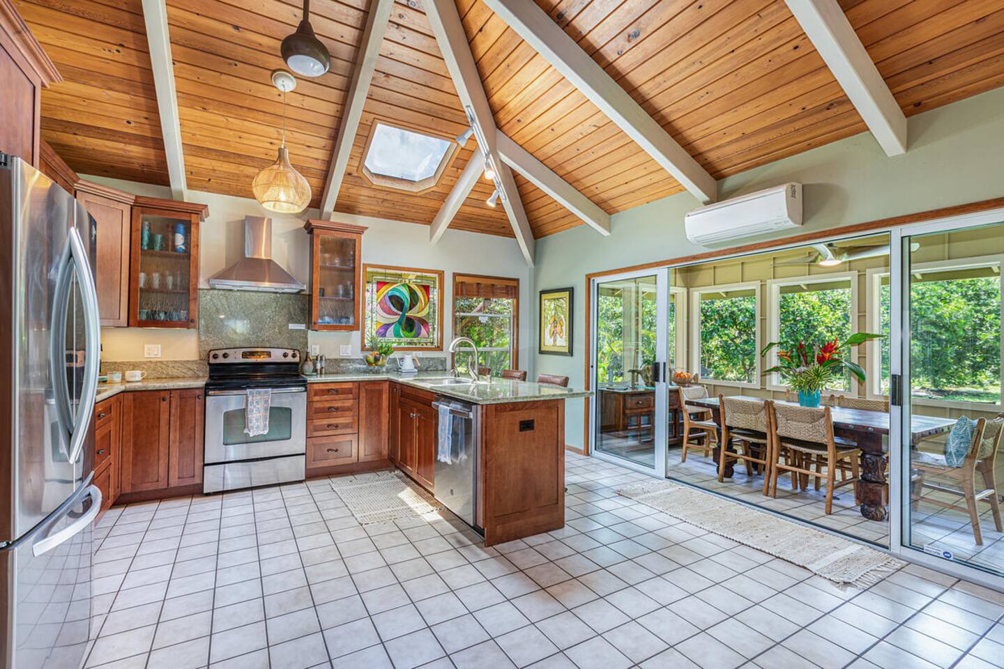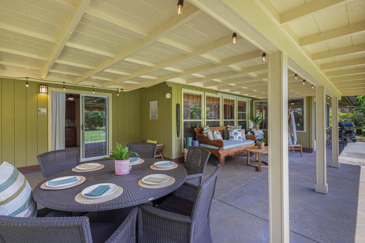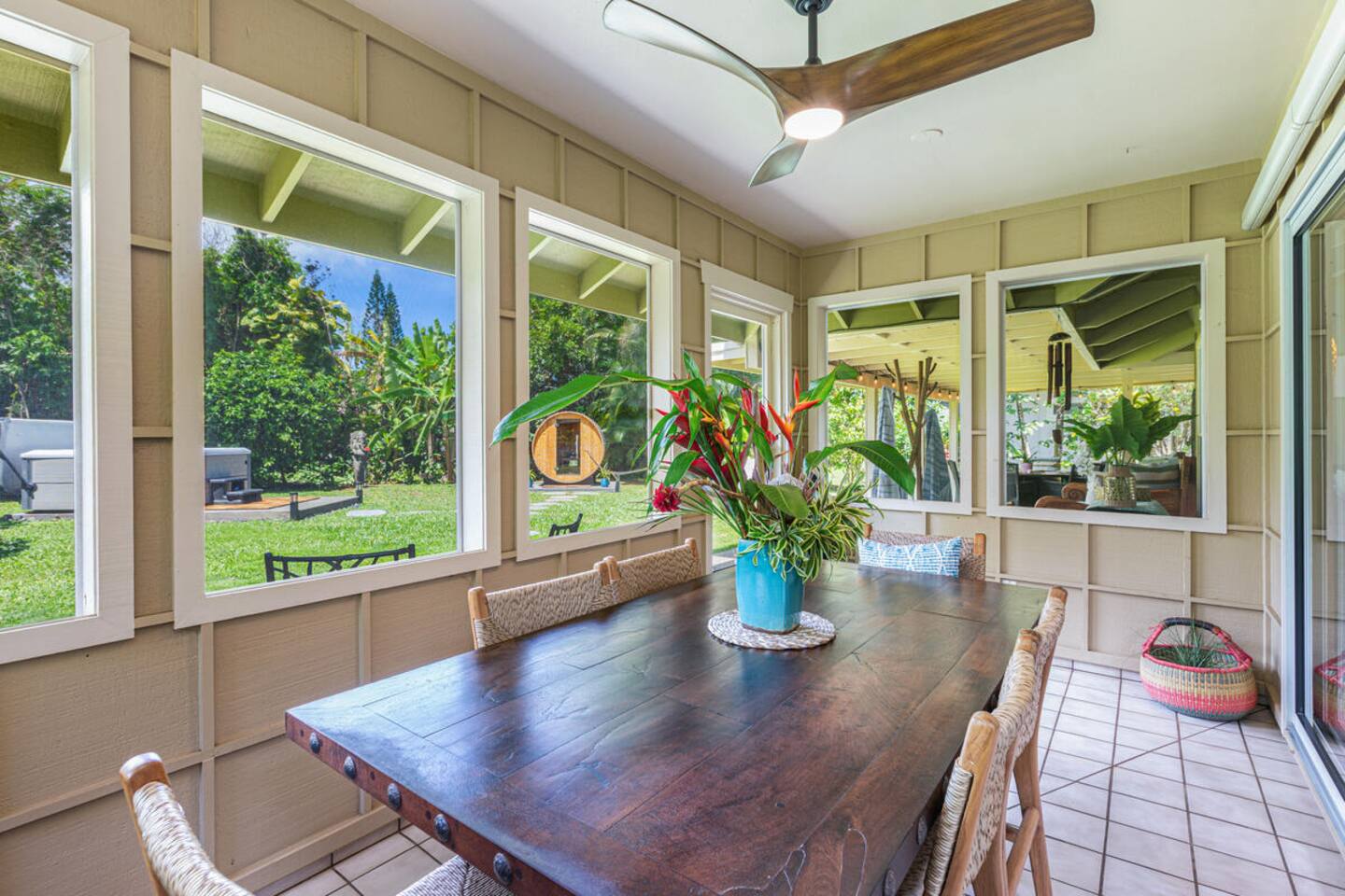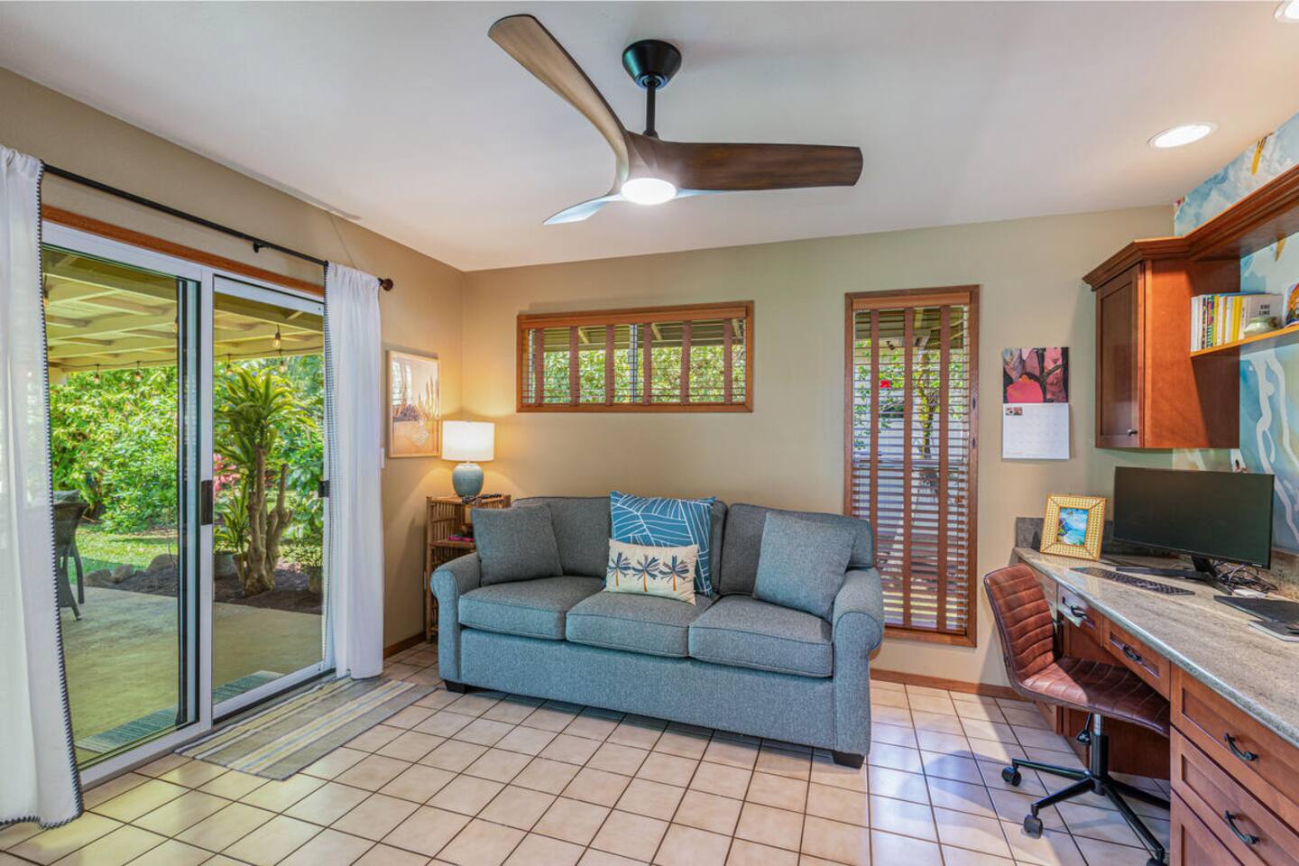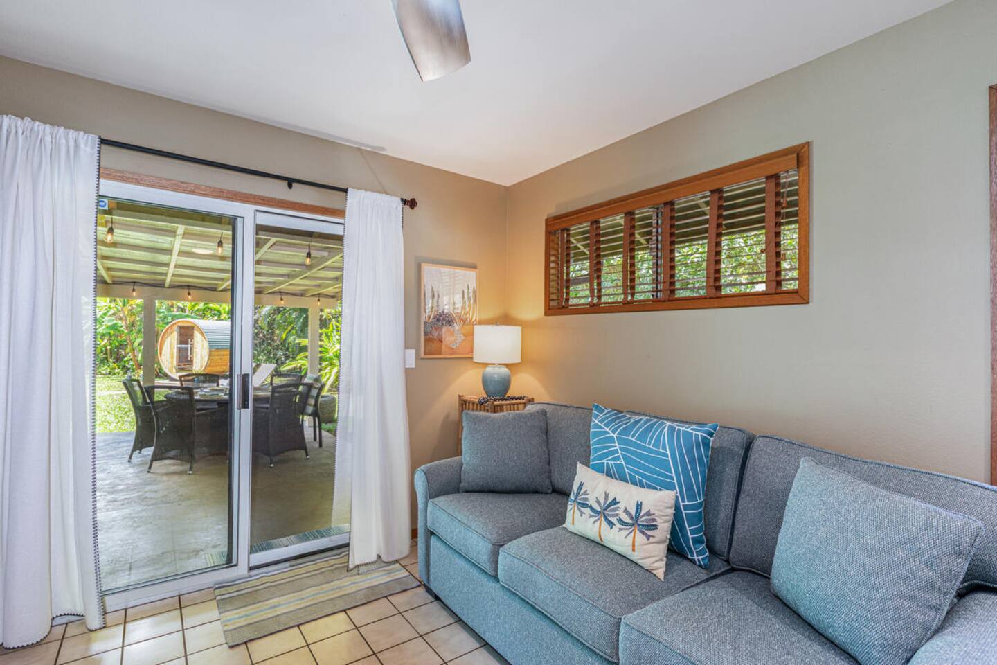Escape to Hale Kalani, a charming 3-bedroom surf bungalow nestled in the heart of Princeville on Kauai’s renowned North Shore. Thoughtfully designed for relaxation and island living, this single-level haven features a private cedar barrel sauna, a brand-new hot tub, and all the comforts of home. As the newest addition from a team of experienced hosts—proudly boasting over 100 five-star reviews—Hale Kalani promises an exceptional stay. Ideally located, this serene getaway puts you within minutes of Kauai’s most treasured spots. Take a short drive to the world-famous Hanalei Bay, where you’ll find pristine sandy beaches, epic surf, and breathtaking mountain vistas. Anini Beach is just a 10-minute stroll away—perfect for snorkeling in calm, turquoise waters protected by the island’s largest reef. For everyday conveniences, the Princeville Center is within walking distance, offering a grocery store, restaurants, and boutique shops. On Saturdays, be sure to visit the nearby farmers market for fresh, local produce and island treats. Inside, Hale Kalani is designed with comfort in mind. Rest easy on elevated, hotel-quality bedding and enjoy plush amenities throughout. After a day of adventure, kick back on the oversized sectional sofa in the spacious living area, complete with a large flat-screen TV and Apple TV for streaming your favorite shows. Stay connected with high-speed Wi-Fi, and keep cool with air conditioning available throughout the home. Step outside and experience the true highlight: the private backyard oasis. Unwind in the hot tub under the stars, or detox and relax in the cedar barrel sauna. Dine al fresco beneath the covered lanai or in the screened-in porch—both offering intimate settings surrounded by lush tropical landscaping. The yard boasts six different fruit trees, offering fresh picks and creating a natural canopy for privacy and tranquility. Families traveling with keiki (children) are welcome! Hale Kalani includes thoughtful touches like a pack-and-play, changing station, sound machine, and bath essentials to make traveling with little ones a breeze. Whether you’re here to surf, snorkel, explore, or simply relax, Hale Kalani offers the perfect home base to experience the magic of Kauai.