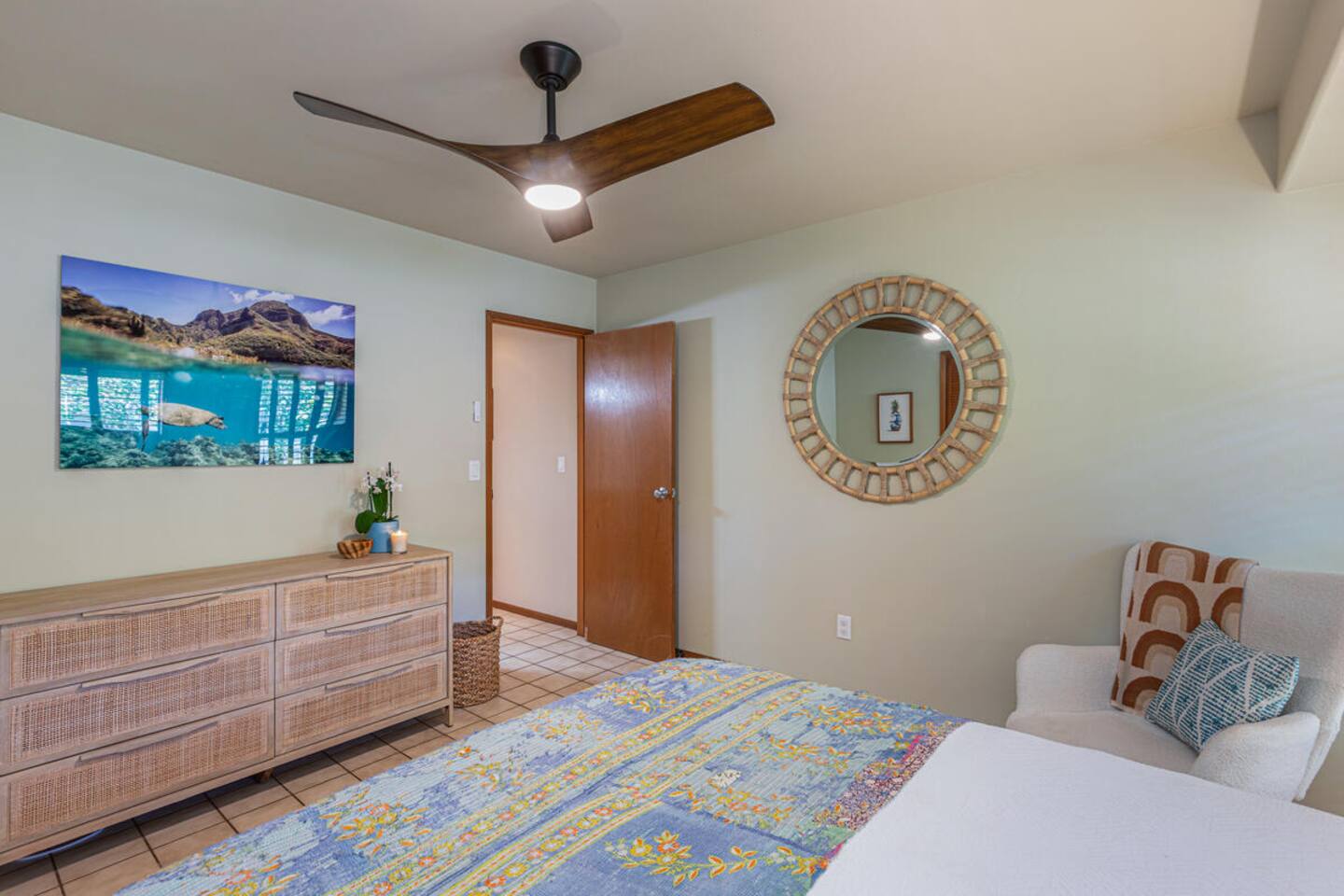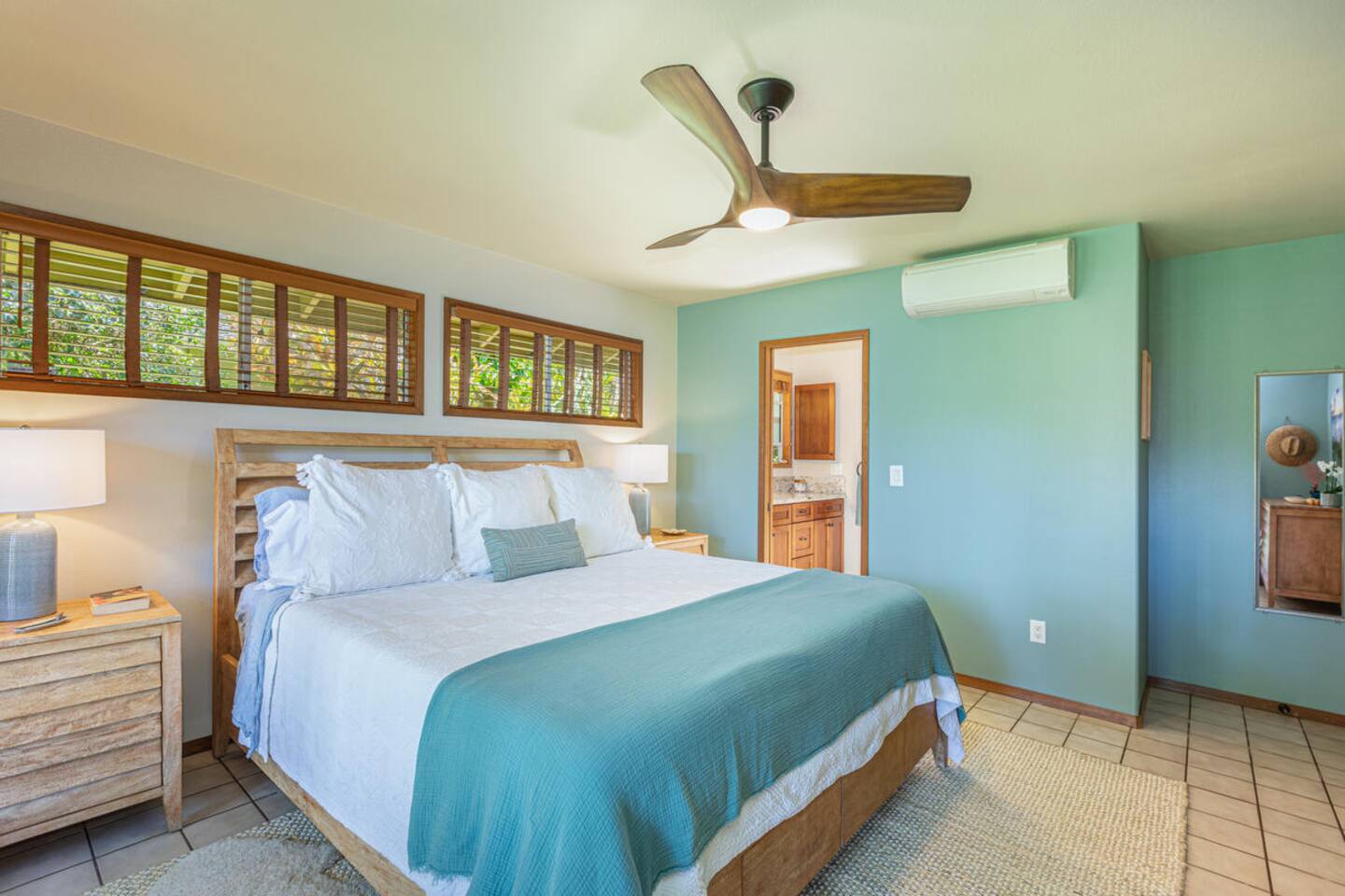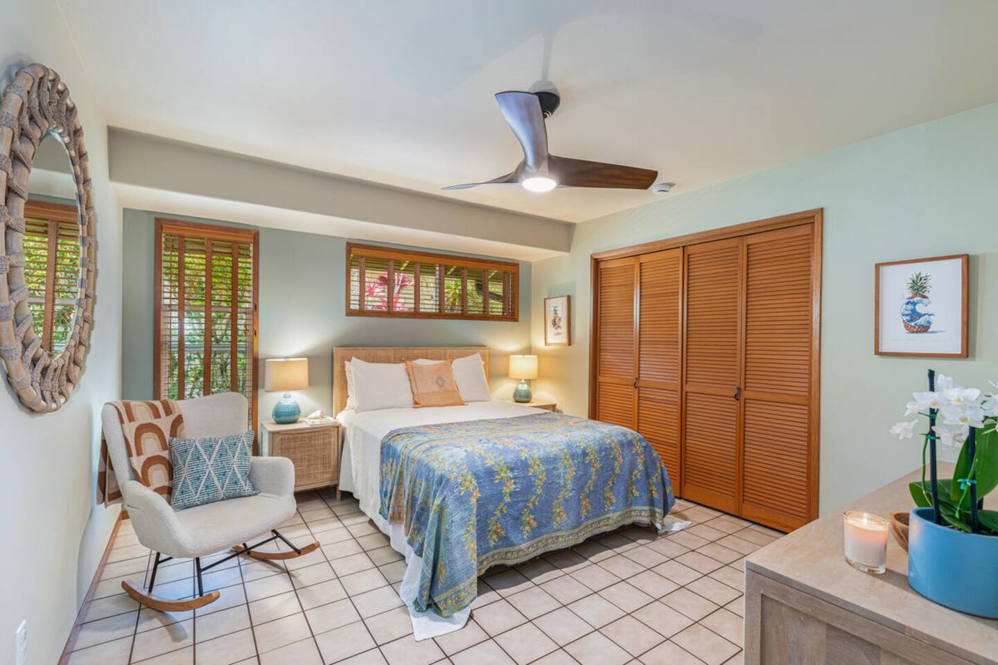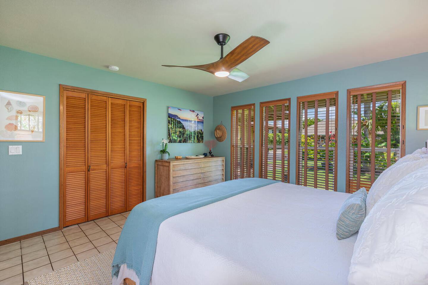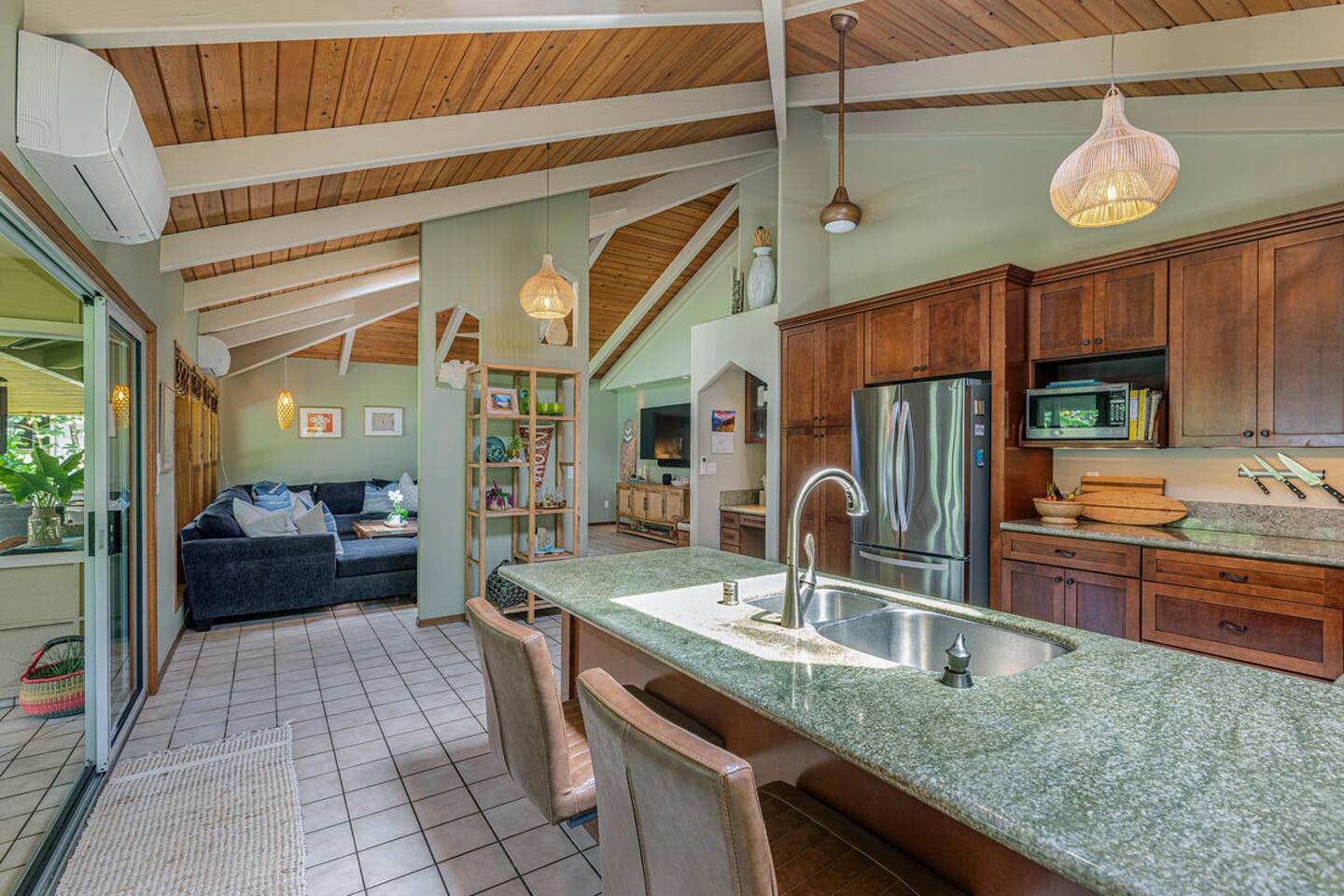 Escape to Hale Kalani, a charming 3-bedroom surf bungalow nestled in the heart of Princeville on Kauai’s renowned North Shore. Thoughtfully designed for relaxation and island living, this single-level haven features a private cedar barrel sauna, a brand-new hot tub, and all the comforts of home. As the newest addition from a team of experienced hosts—proudly boasting over 100 five-star reviews—Hale Kalani promises an exceptional stay. Ideally located, this serene getaway puts you within minutes of Kauai’s most treasured spots. Take a short drive to the world-famous Hanalei Bay, where you’ll find pristine sandy beaches, epic surf, and breathtaking mountain vistas. Anini Beach is just a 10-minute stroll away—perfect for snorkeling in calm, turquoise waters protected by the island’s largest reef. For everyday conveniences, the Princeville Center is within walking distance, offering a grocery store, restaurants, and boutique shops. On Saturdays, be sure to visit the nearby farmers market for fresh, local produce and island treats. Inside, Hale Kalani is designed with comfort in mind. Rest easy on elevated, hotel-quality bedding and enjoy plush amenities throughout. After a day of adventure, kick back on the oversized sectional sofa in the spacious living area, complete with a large flat-screen TV and Apple TV for streaming your favorite shows. Stay connected with high-speed Wi-Fi, and keep cool with air conditioning available throughout the home. Step outside and experience the true highlight: the private backyard oasis. Unwind in the hot tub under the stars, or detox and relax in the cedar barrel sauna. Dine al fresco beneath the covered lanai or in the screened-in porch—both offering intimate settings surrounded by lush tropical landscaping. The yard boasts six different fruit trees, offering fresh picks and creating a natural canopy for privacy and tranquility. Families traveling with keiki (children) are welcome! Hale Kalani includes thoughtful touches like a pack-and-play, changing station, sound machine, and bath essentials to make traveling with little ones a breeze. Whether you’re here to surf, snorkel, explore, or simply relax, Hale Kalani offers the perfect home base to experience the magic of Kauai.